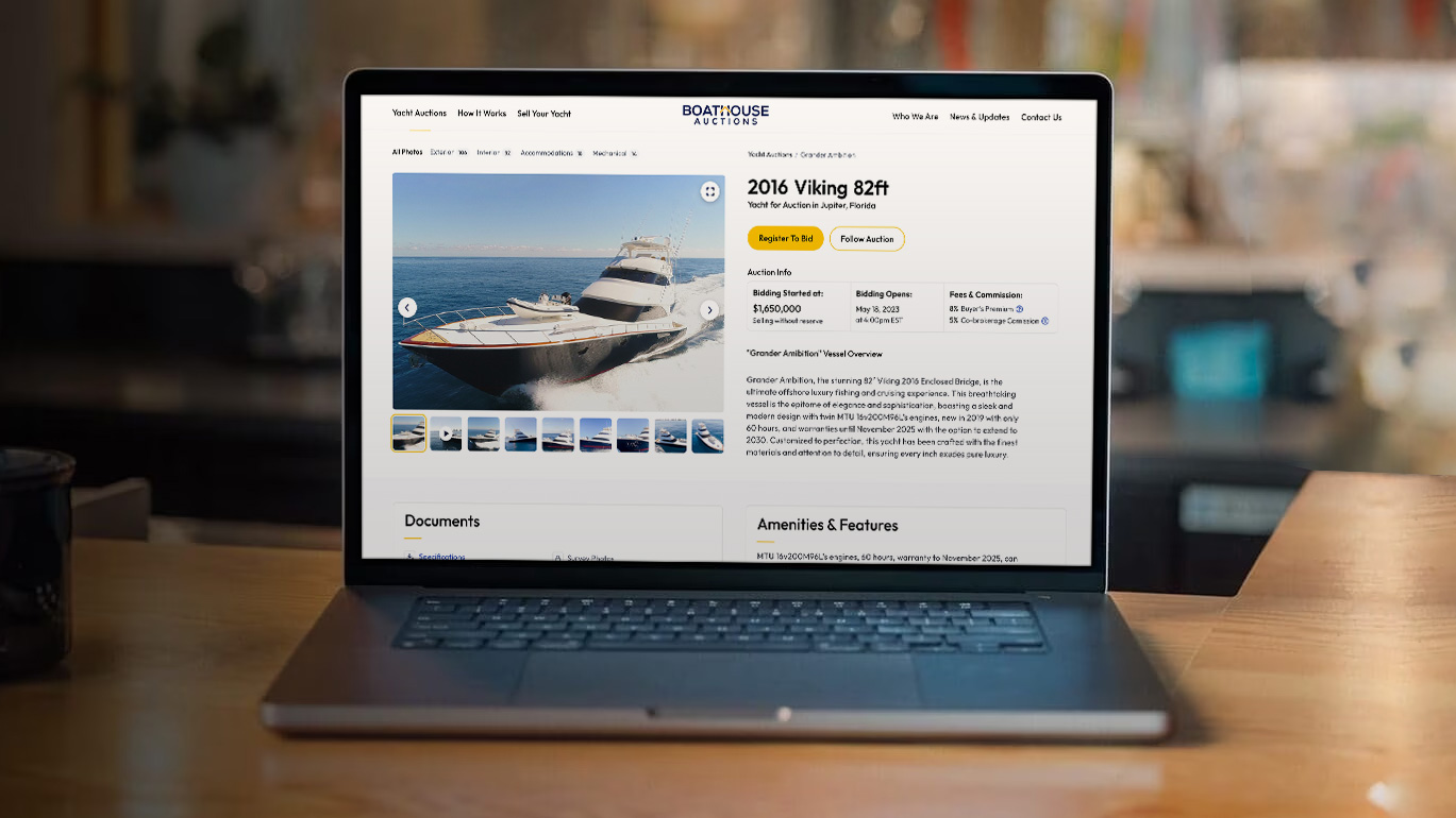 Boathouse Auctions enables buyers and sellers to participate in boat auctions from their computer or mobile device in real-time from anywhere in the world. Sign-up for free to watch auctions happen in real-time through our state-of-the-art bidding platform. See an auction you like? Register to bid to participate online or work directly with our in-house team of yacht auction experts to help place your bid.