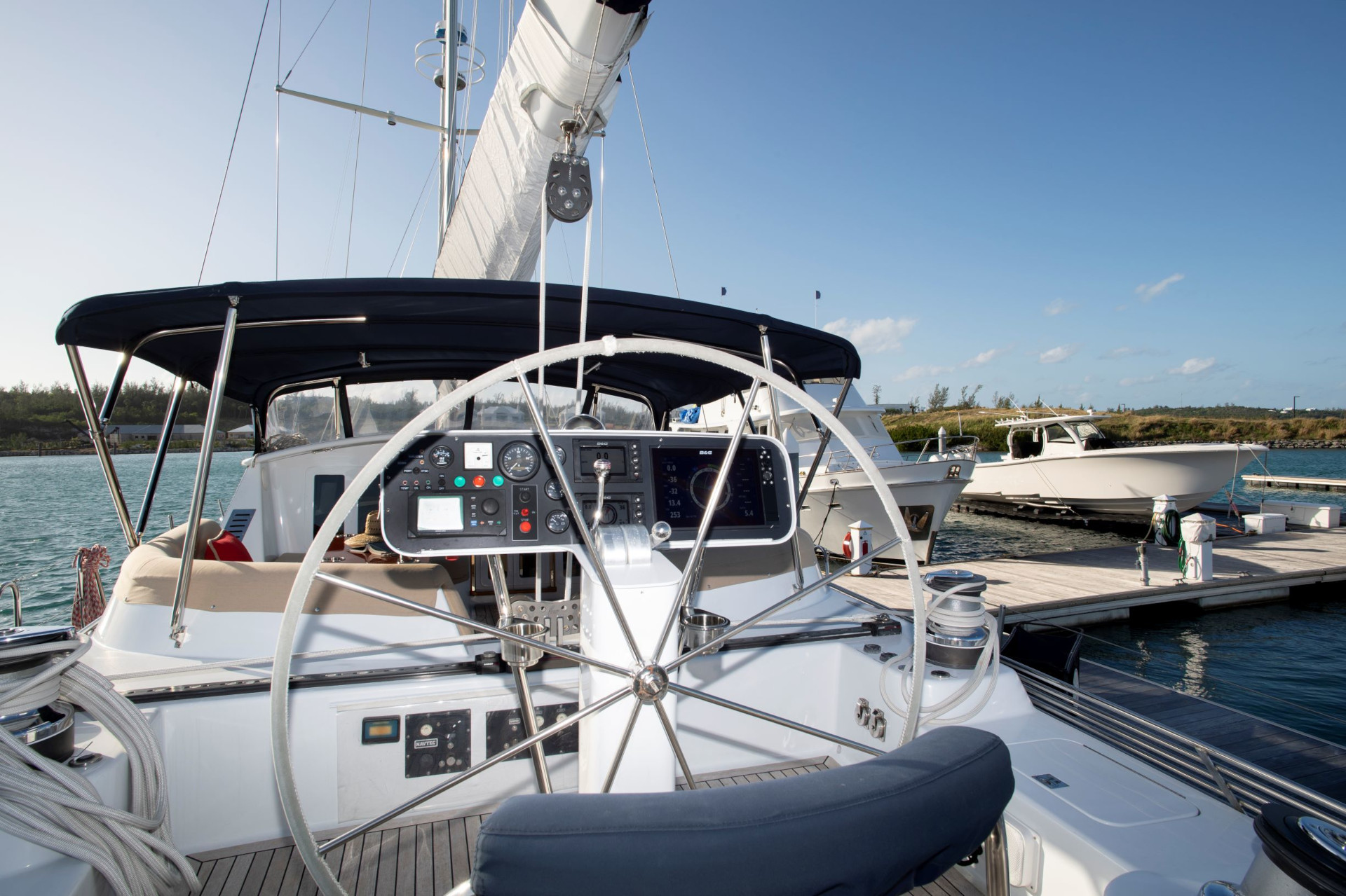 Falcon features a split cockpit configuration. The forward cockpit, just outside the pilothouse entry, is fully covered by the Sunbrella Bimini top and includes two dining tables, one on each side, with a circular lounge encompassing the tables.The second cockpit just aft has the helm, sail controls, and a full array of navigational equipment upgraded in 2019. The two hydraulic roller furler head stays are controllable form this cockpit. There are separate hydraulic winches on each side for the headsails and a set of smaller self-tailing winches aft. The outhaul, boom vang, and backstay are all adjusted using hydraulic controls in the after cockpit.On deck forward is the anchor windlass with foot controls. At the mast are three winches controlling all halyards and reefing lines for sail control. One winch is a two-speed hydraulic, and the other two are two-speed self-tailing.Rising above the sail controls is a four-spreader sloop rig with lazy jacks to assist sail control newly installed in 2019.